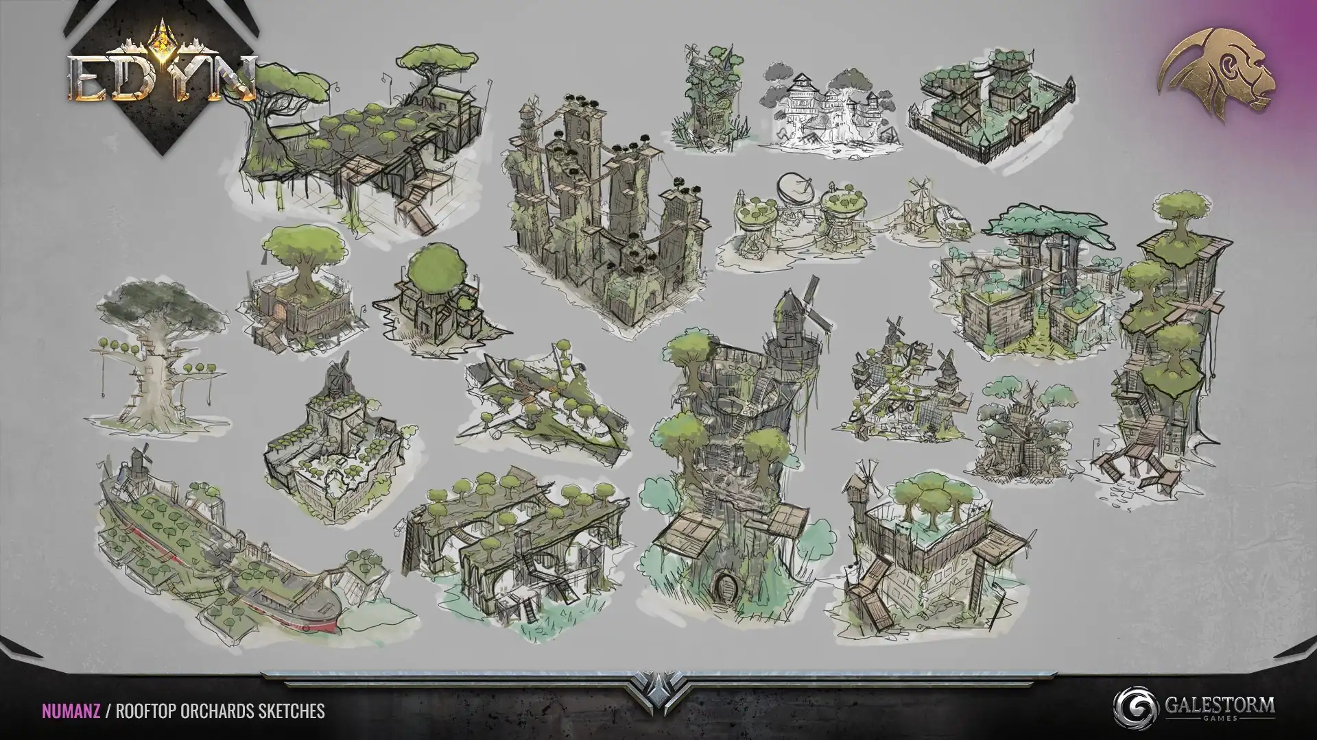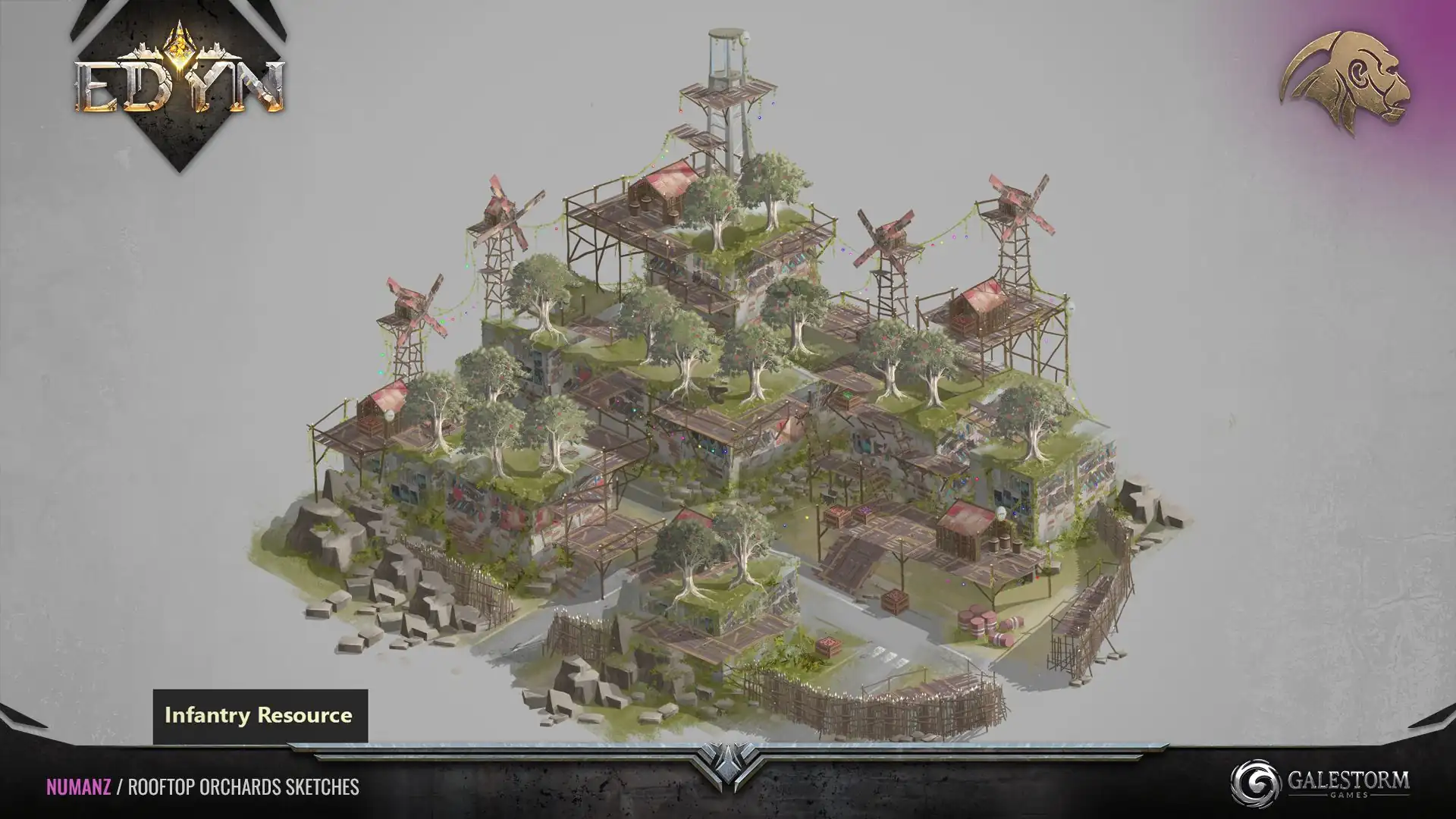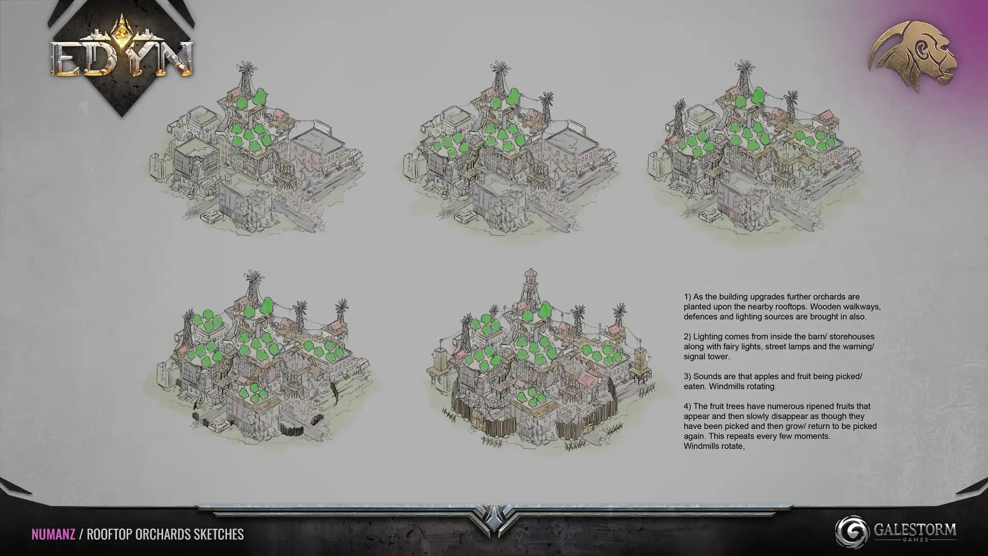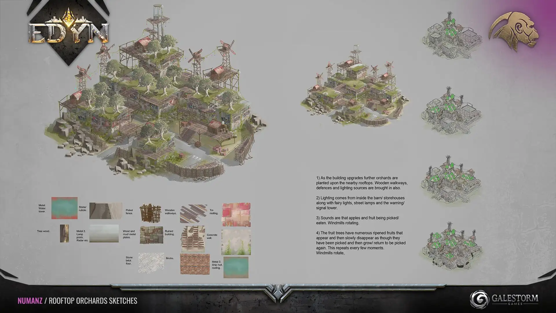 Planted high above on the rooftops, lush orchards evoke the canopies of ancient forests. Far removed from the chaos below, fruit grows quickly here, providing a sustainable way for the more patient Numanz to feed the entire tribe.
