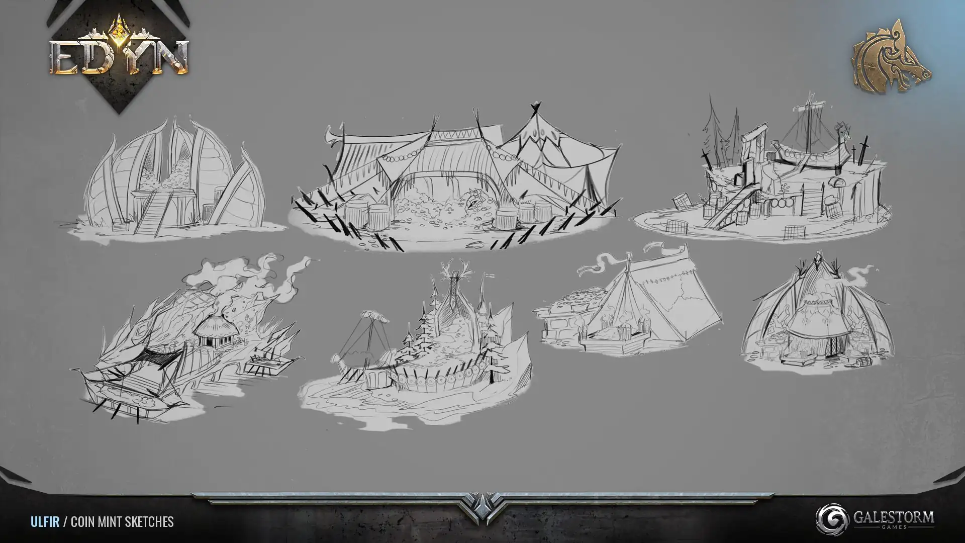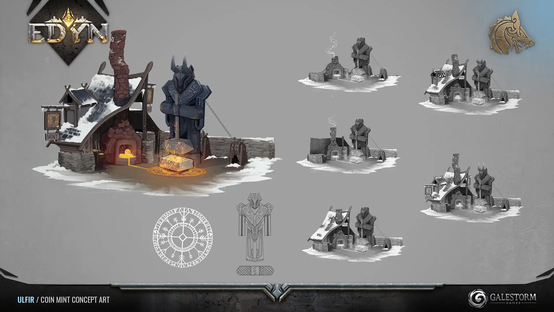 The sounds of hammer to anvil are much lighter here than at the Workshop. Those Ulfir not loping along the warrior's path are known throughout Edyn as impressive artisans with fine taste. Each coin produced is its own small work of art. Though all are valued the same, no coin is truly identical as each smith fashions their own insignia.